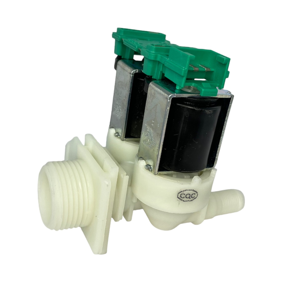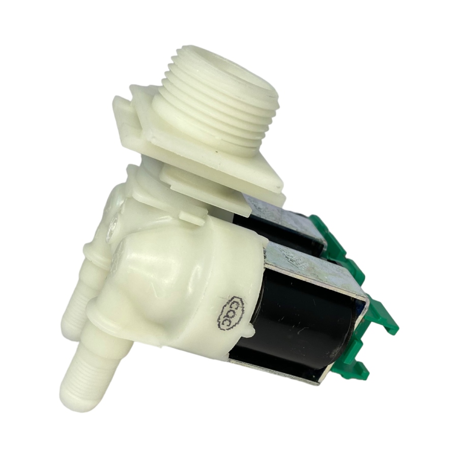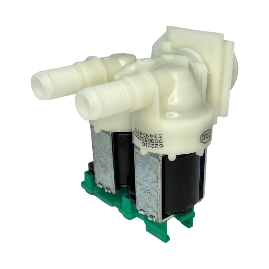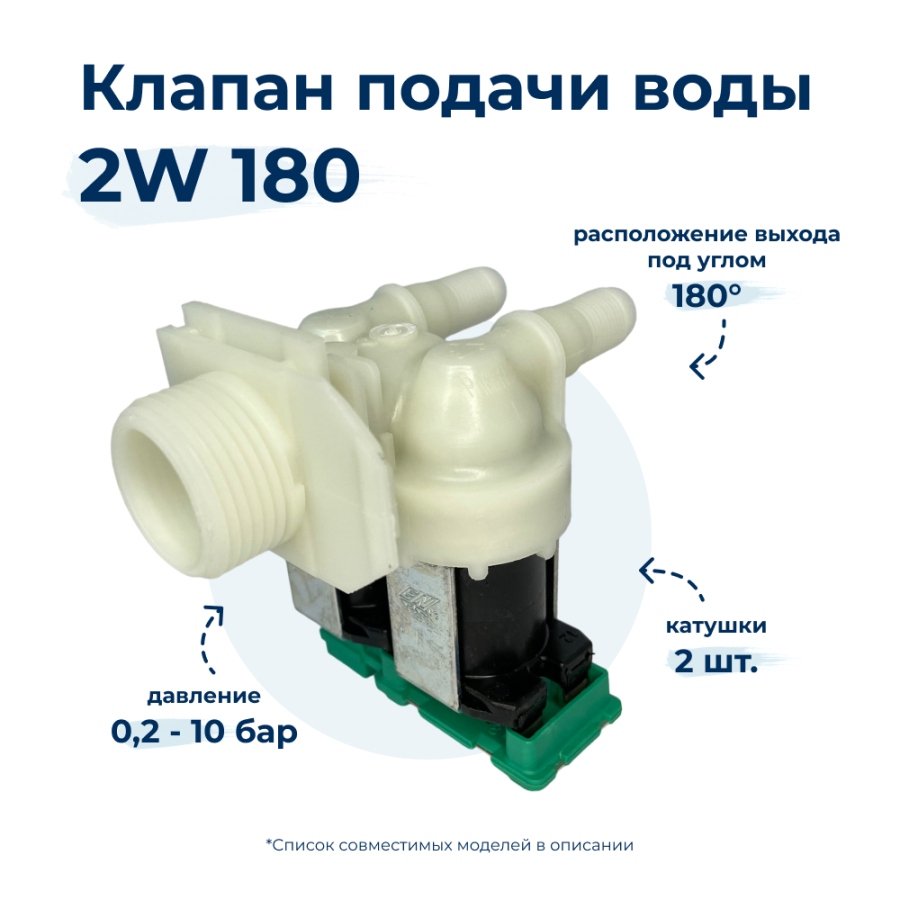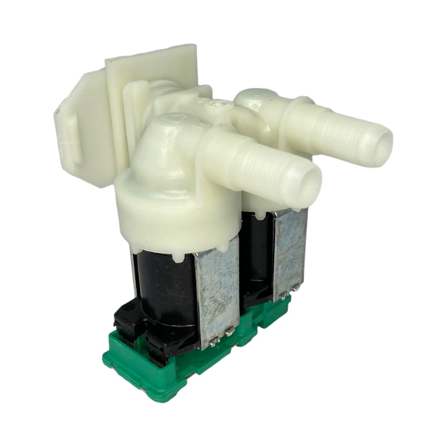 Впускной клапан стиральной машины Bosch/Siemens устроен по тому же принципу, как и в других марках: при подаче сигнала управления заглушка открывается, и вода поступает в барабан. Представленный электроклапан имеет 2 катушки и 180 градусов между входом и выходом. Клеммы для подключения к электросети под фишку. На входе клапана установлена пластмассовая фильтрационная сетка, которая задерживает частицы ржавчины и примеси из водопроводной воды.