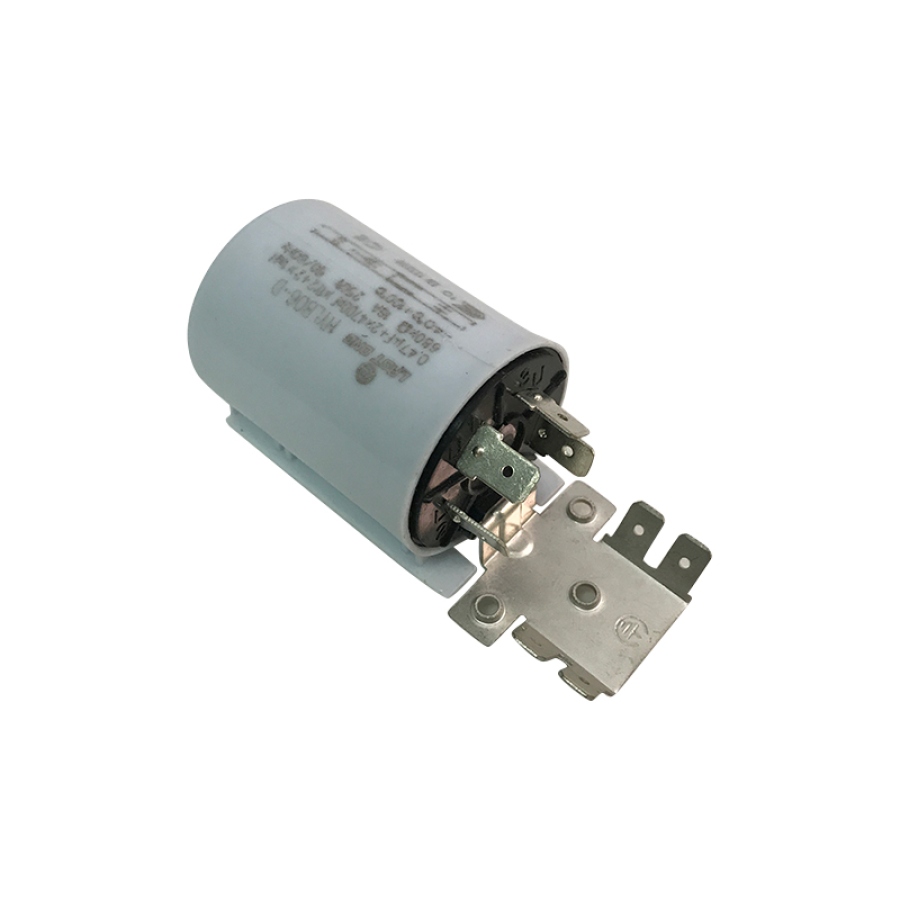 Сетевой фильтр радиопомех HYLB06-D. Предназначен для защиты от резких перепадов напряжения. Расположен рядом с местом выхода шнура питания стиральной машины. Маркировка и параметры изделия: емкость 47uF, 16A, рабочее напряжение переменного тока 250V, частотный диапазон 50/60Hz.