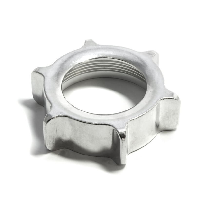 Конструкция из нержавеющей стали обеспечивает долговечность и устойчивость к коррозии. Гайка накручивается на резьбовую часть тубуса и фиксирует нож с решёткой в рабочем положении. Рассчитана на многократное использование при эксплуатации мясорубки.