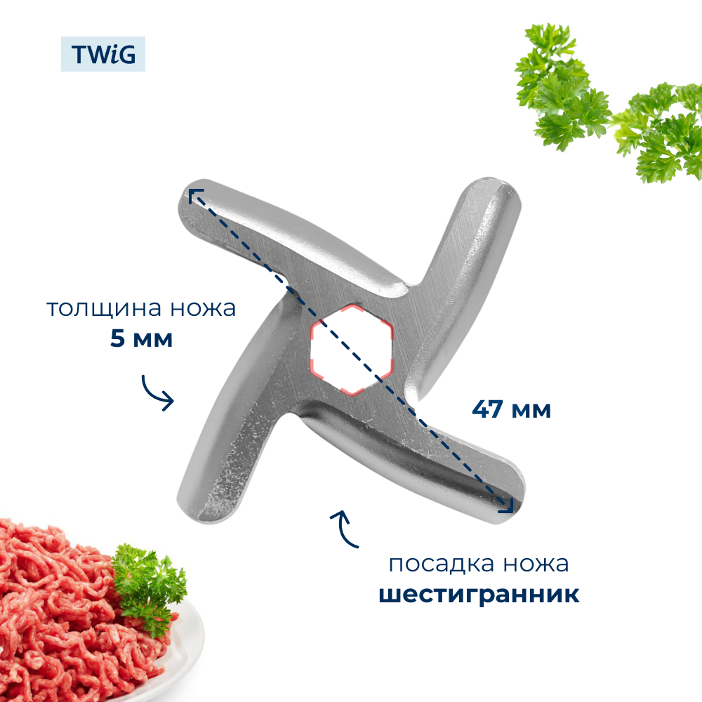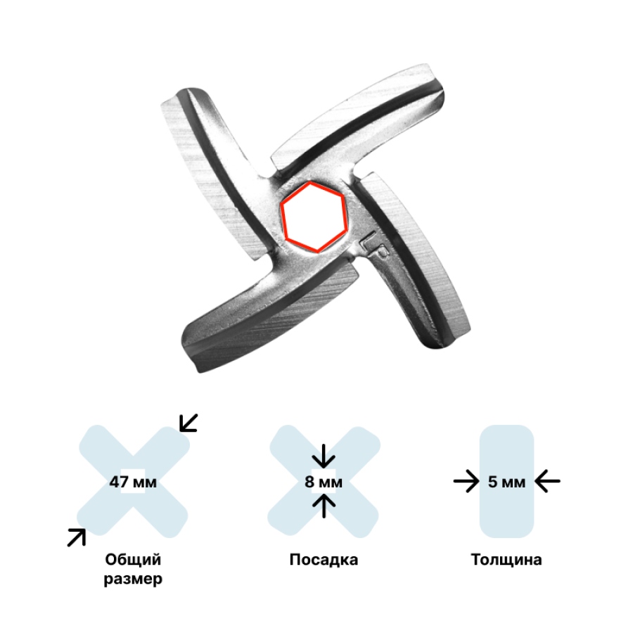 Нож для мясорубки подходит для моделей Kitfort KT-2107, KT-2112-1, KT-2112-2, KT-2112-3, KT-2113-1, KT-2113-2, KT-2113-3. Четырехлопастной режущий элемент выполнен из качественной стали с односторонней заточкой, что обеспечивает равномерное измельчение мяса и превращение его в фарш. Диаметр ножа составляет 47 мм, толщина — 5 мм, посадочное место — шестигранник.