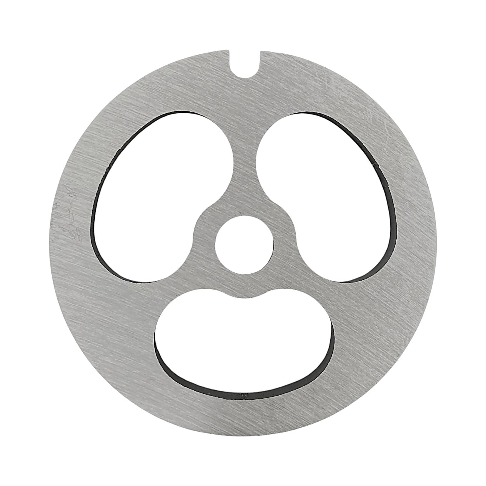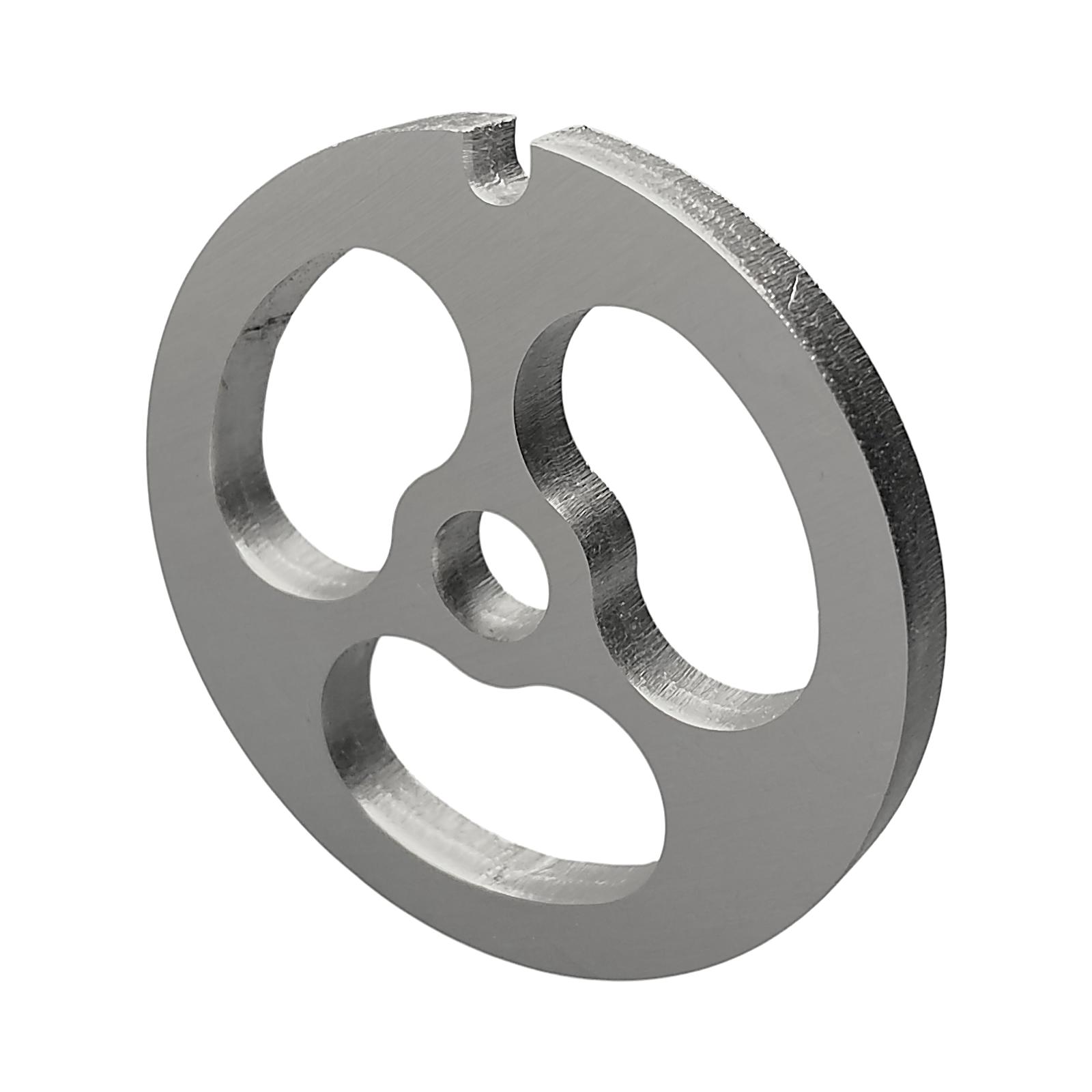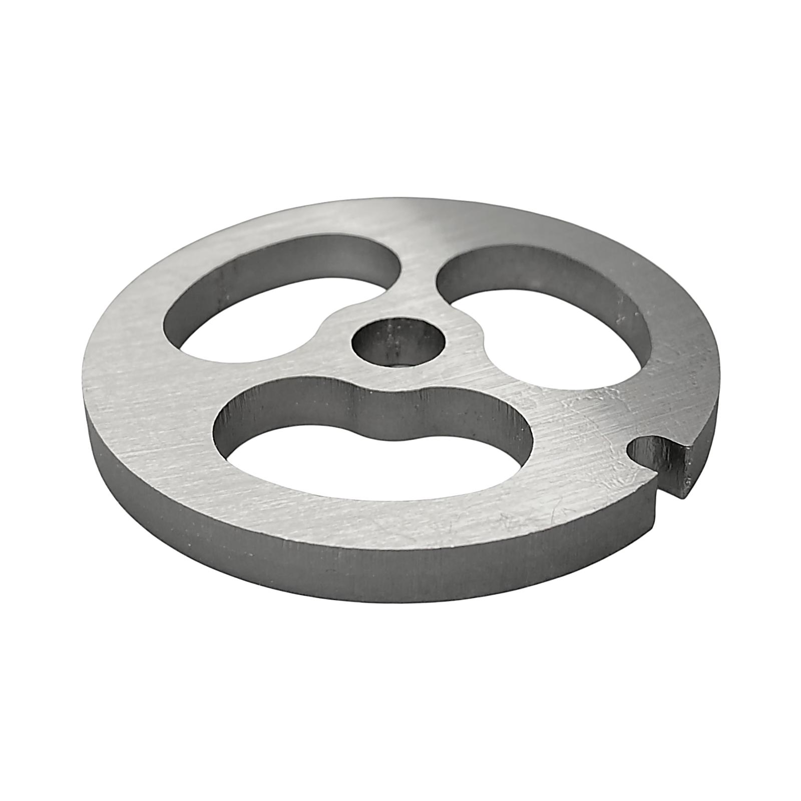 Решетка предназначена для переработки мяса крупной фракцией, обеспечивая нарезку кусочками. Устанавливается на шнек мясорубки, располагаясь между режущим ножом и прижимной гайкой.