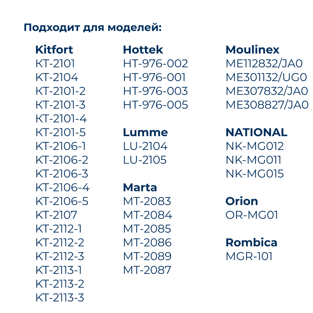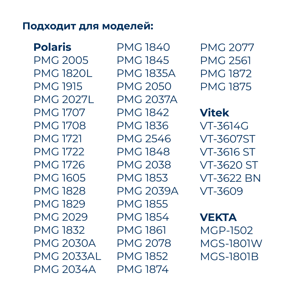 Совместимость: Aceline, Aresa, Atlanta, BBK, Centek, Daewoo, Delfa, DEXP, ECON, Elenberg, Galaxy, Haier, Hottek, Kitfort, Lumme, Marta, Moulinex, NATIONAL, Orion, Polaris, Redmond, Rombica, Saturn, Scarlett, StarWind, Supra, Tuvio, Unit, VEKTA, Vitek, Панасоник