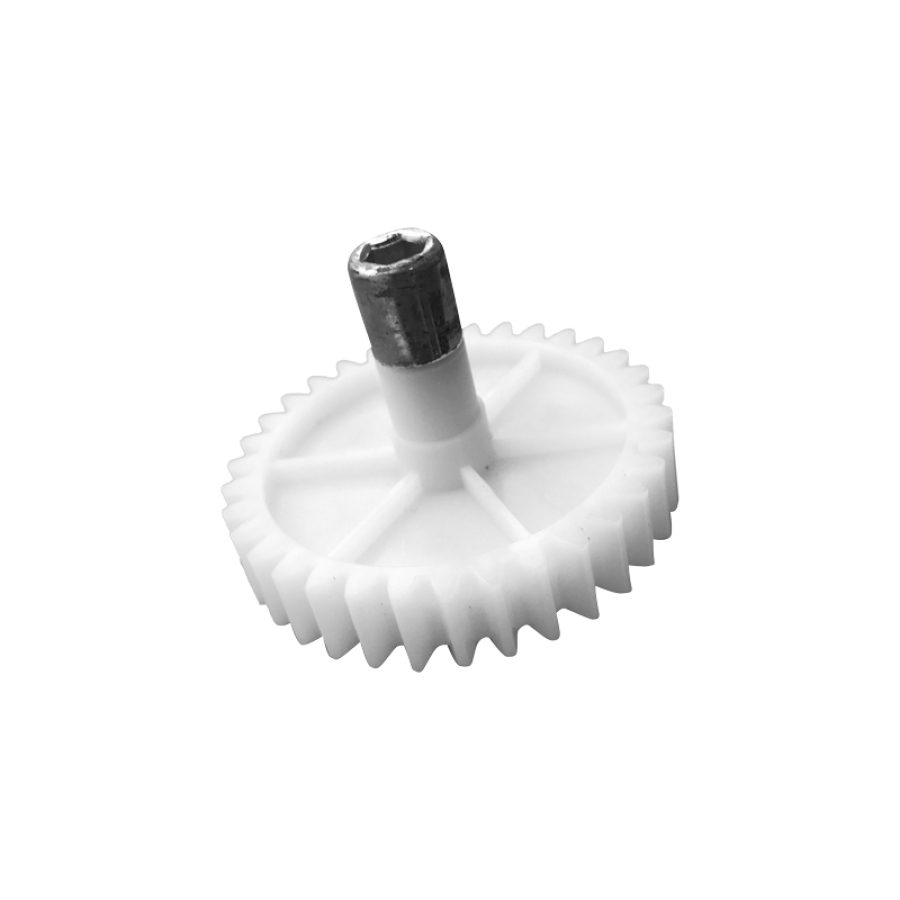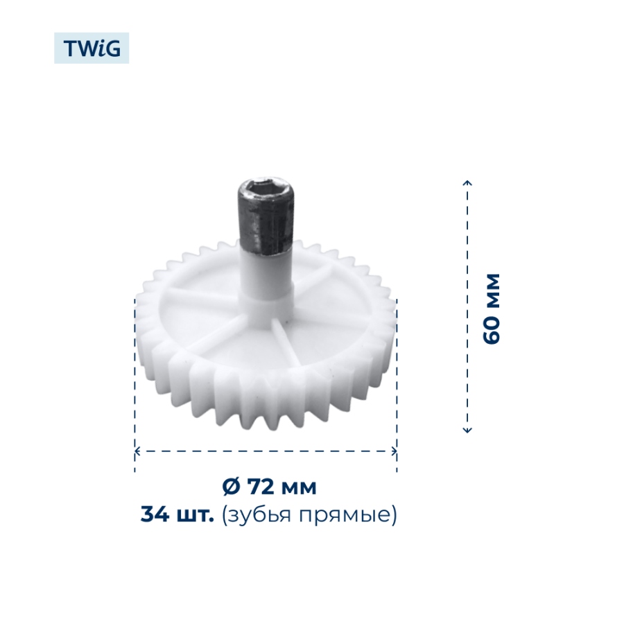 Изделие выполнено из комбинированных материалов: корпус шестерни изготовлен из прочного пластика, а центральный вал — из металла, что значительно повышает надёжность узла и его устойчивость к деформациям под нагрузкой. Внешний диаметр составляет 72 мм, высота конструкции — 60 мм. Шестерня оснащена 34 зубьями с прямым наклоном, что гарантирует надёжное зацепление с ведущей шестерней и точную передачу вращательного момента в редукторе мясорубки. Металлический вал обеспечивает жёсткую посадку и исключает осевой люфт, что особенно важно при интенсивных нагрузках. Стандартная геометрия зубьев позволяет детали точно встраиваться в механизм.