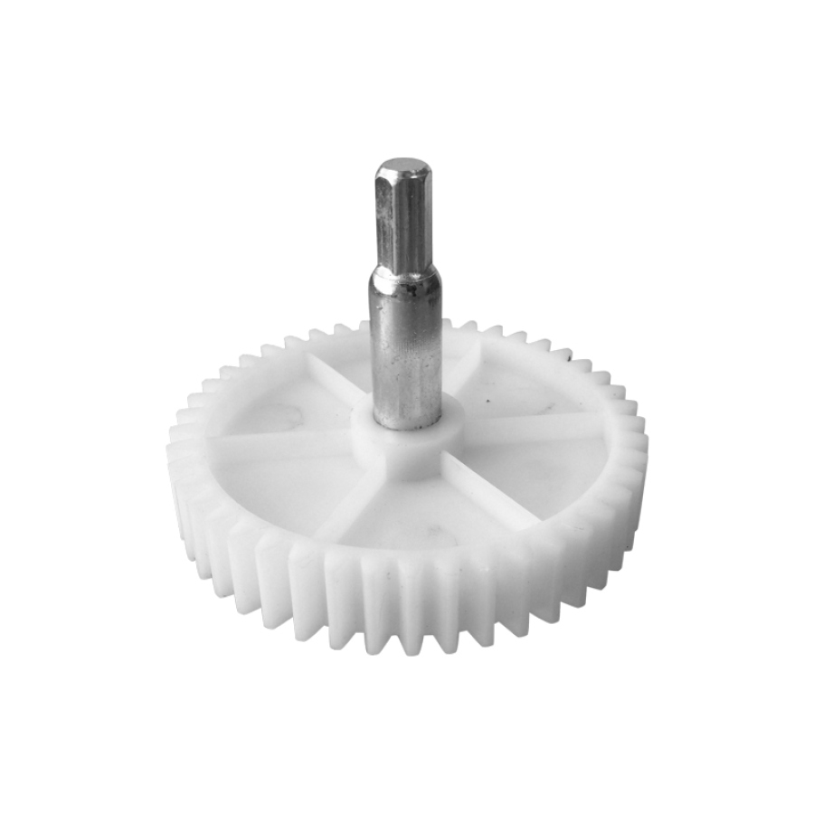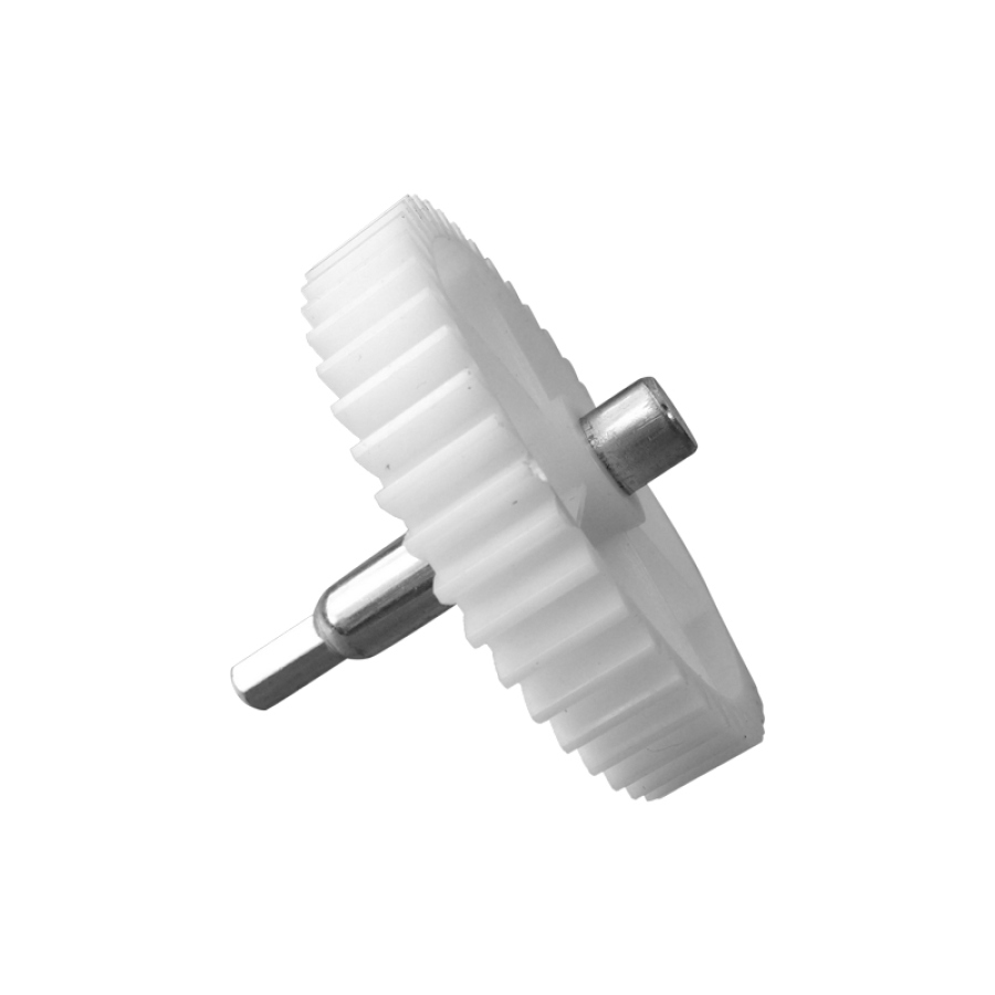 Изделие выполнено из комбинированных материалов: корпус шестерни изготовлен из прочного пластика, а центральный вал — из металла, что значительно повышает надёжность узла и его устойчивость к деформациям. Внешний диаметр составляет 12 мм (малый) и 82 мм (большой), высота конструкции — 72 мм. Шестерня оснащена 45 зубьями с прямым наклоном, что обеспечивает надёжное зацепление с ведущей шестерней и точную передачу крутящего момента в редукторе мясорубки. Металлический вал гарантирует жёсткую посадку и исключает осевой люфт, что особенно важно при интенсивных нагрузках. Увеличенная высота детали обеспечивает дополнительную прочность конструкции.