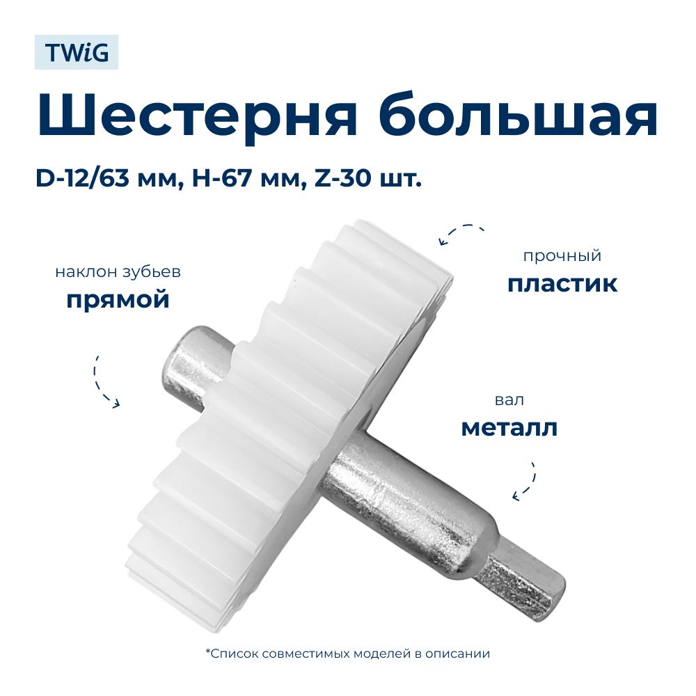 Диаметр шестерни составляет 63 мм, высота — 67 мм. Конструкция включает 30 прямых зубьев, обеспечивающих надежное сцепление с редуктором. Оснащена металлическим валом диаметром 12 мм, что повышает прочность и долговечность детали.