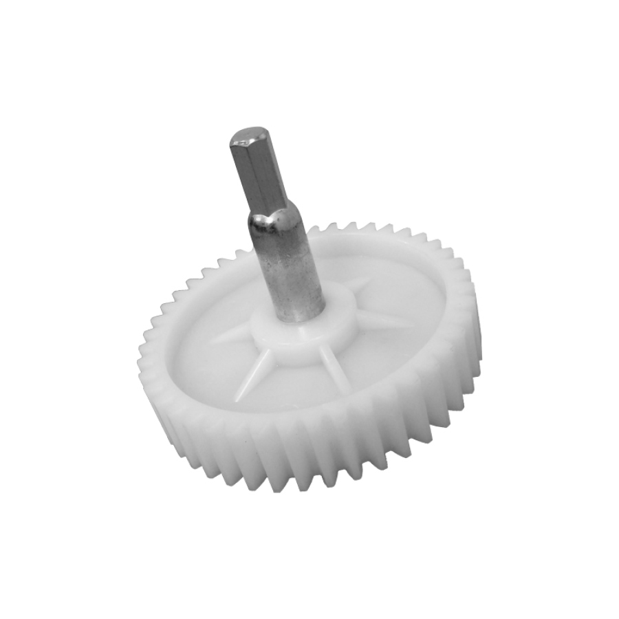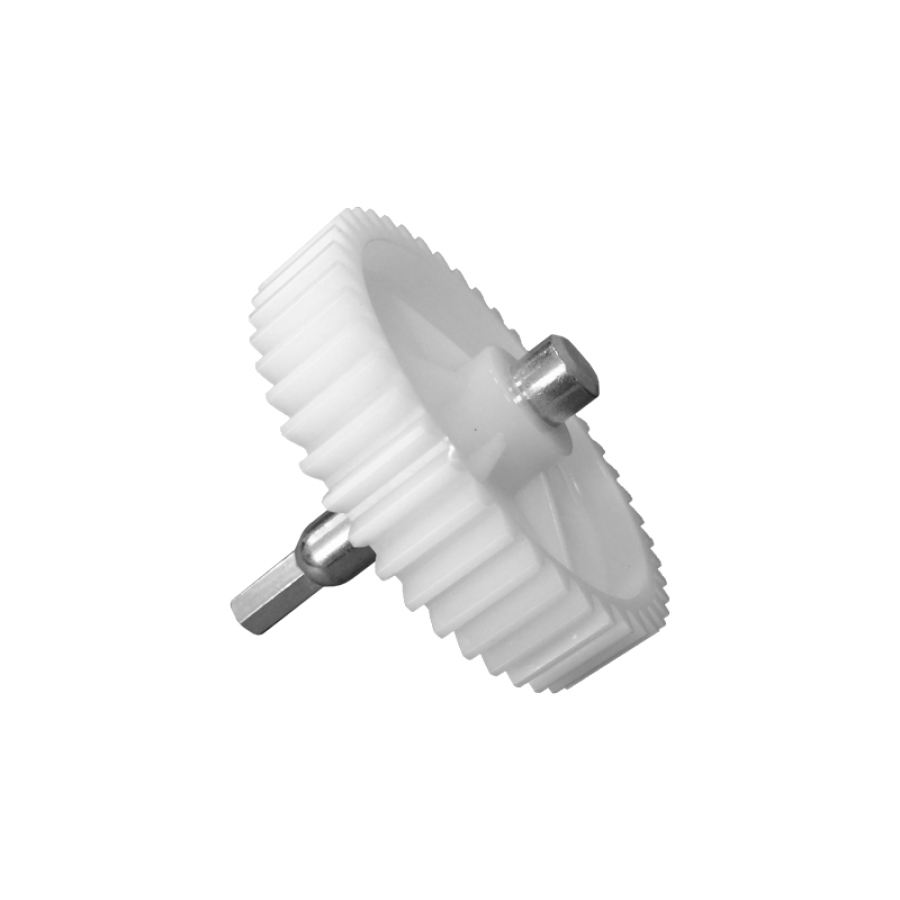 Диаметр — 80 мм, высота — 75 мм, количество зубьев — 44, наклон зубьев прямой. Материал шестерни — пластик, материал вала — металл. Конструкция рассчитана на надёжную фиксацию и устойчивую передачу крутящего момента внутри редуктора.