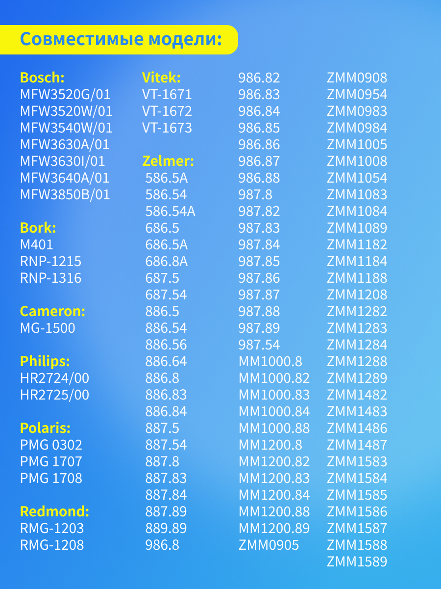 Bosch MFW3520G/01 Bosch MFW3520W/01 Bosch MFW3540W/01 Bosch MFW3630A/01 Bosch MFW3630I/01 Bosch MFW3640A/01 Bosch MFW3850B/01 Cameron MG-1500 Polaris PMG 0302 Polaris PMG 1707 Polaris PMG 1708 Redmond RMG-1203 Redmond RMG-1203-8 Redmond RMG-1208 Vitek VT-1671 Vitek VT-1672 Vitek VT-1673 Zelmer 586.54 Zelmer 586.54A Zelmer 586.5A Zelmer 686.5 Zelmer 686.5A Zelmer 686.8A Zelmer 687.5 Zelmer 687.54 Zelmer 886.5 Zelmer 886.54 Zelmer 886.56 Zelmer 886.64 Zelmer 886.8 Zelmer 886.83 Zelmer 886.84 Zelmer 887.5 Zelmer 887.54 Zelmer 887.8 Zelmer 887.83 Zelmer 887.84 Zelmer 887.89 Zelmer 889.89 Zelmer 986.8 Zelmer 986.82 Zelmer 986.83 Zelmer 986.84 Zelmer 986.85 Zelmer 986.86 Zelmer 986.87 Zelmer 986.88 Zelmer 987.54 Zelmer 987.8 Zelmer 987.82 Zelmer 987.83 Zelmer 987.84 Zelmer 987.85 Zelmer 987.86 Zelmer 987.87 Zelmer 987.88 Zelmer 987.89 Zelmer MM1000.8 Zelmer MM1000.82 Zelmer MM1000.83 Zelmer MM1000.84 Zelmer MM1000.88 Zelmer MM1200.8 Zelmer MM1200.82 Zelmer MM1200.83 Zelmer MM1200.84 Zelmer MM1200.88 Zelmer MM1200.89 Zelmer ZMM0905 Zelmer ZMM0908 Zelmer ZMM0954 Zelmer ZMM0983 Zelmer ZMM0984 Zelmer ZMM1005 Zelmer ZMM1008 Zelmer ZMM1054 Zelmer ZMM1083 Zelmer ZMM1084 Zelmer ZMM1089 Zelmer ZMM1182 Zelmer ZMM1184 Zelmer ZMM1188 Zelmer ZMM1208 Zelmer ZMM1282 Zelmer ZMM1283 Zelmer ZMM1284 Zelmer ZMM1288 Zelmer ZMM1289 Zelmer ZMM1482 Zelmer ZMM1483 Zelmer ZMM1486 Zelmer ZMM1487 Zelmer ZMM1583 Zelmer ZMM1584 Zelmer ZMM1585 Zelmer ZMM1586 Zelmer ZMM1587 Zelmer ZMM1588 Zelmer ZMM1589Смотреть весь список моделей Свернуть список моделей