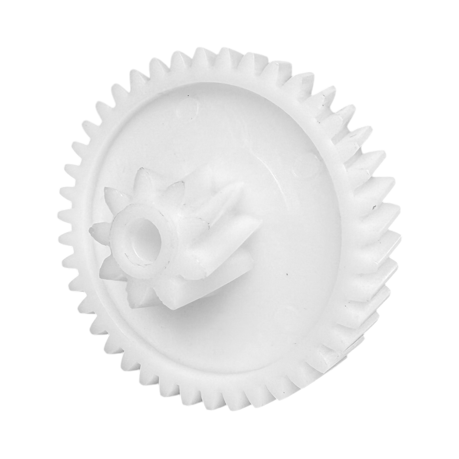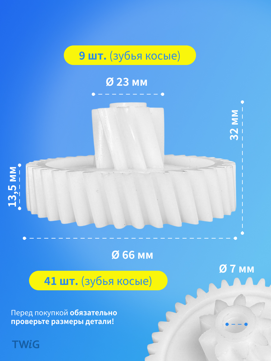 Шестерня изготовлена из прочного пластика и имеет размеры: внешний диаметр 23/66 мм, высота 32 мм, высота нижнего круга 13,5 мм. Оснащена 9 (малый круг) и 41 (большой круг) зубом, косого направления (слева направо), что способствует плавному вращению без рывков. Внутренний диаметр отверстия под вал – 7 мм. Такая геометрия обеспечивает надежную посадку и эффективную работу в условиях высокой нагрузки.