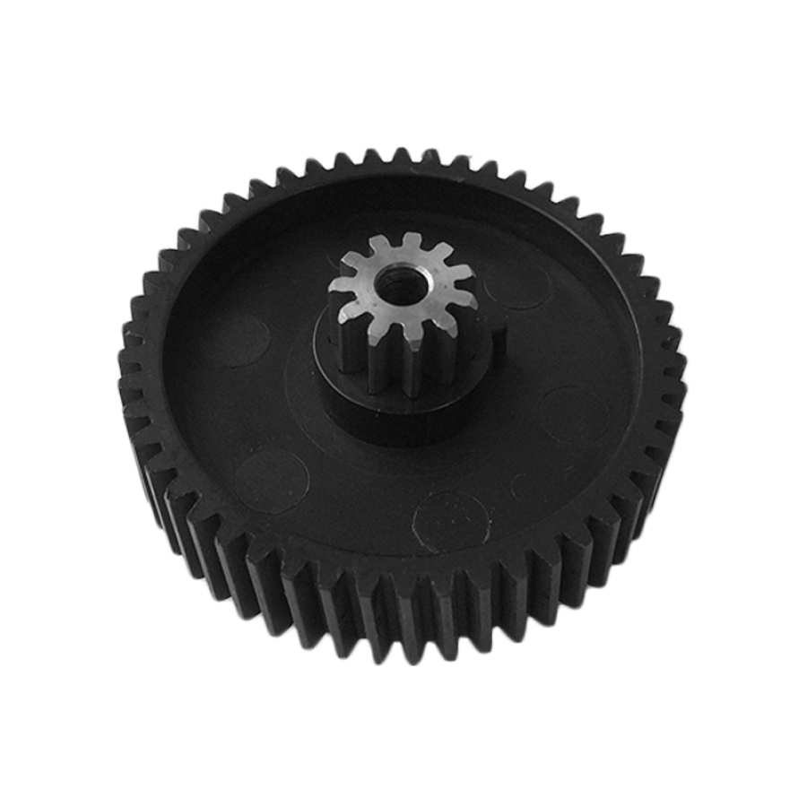 Диаметр составляет 12 мм (малая ступень) и 46 мм (большая ступень), высота — 22 мм, количество зубьев — 11/55. Наклон зубьев комбинированный: на малом диаметре — прямой, на большом — косой, что обеспечивает плавность хода и снижение вибраций при передаче момента. Конструкция выполнена из двух материалов: верхняя малая часть — металлическая, обеспечивающая прочность и надёжную фиксацию на валу; большая коронка изготовлена из пластика, который снижает шумность работы и уменьшает нагрузку на редуктор.