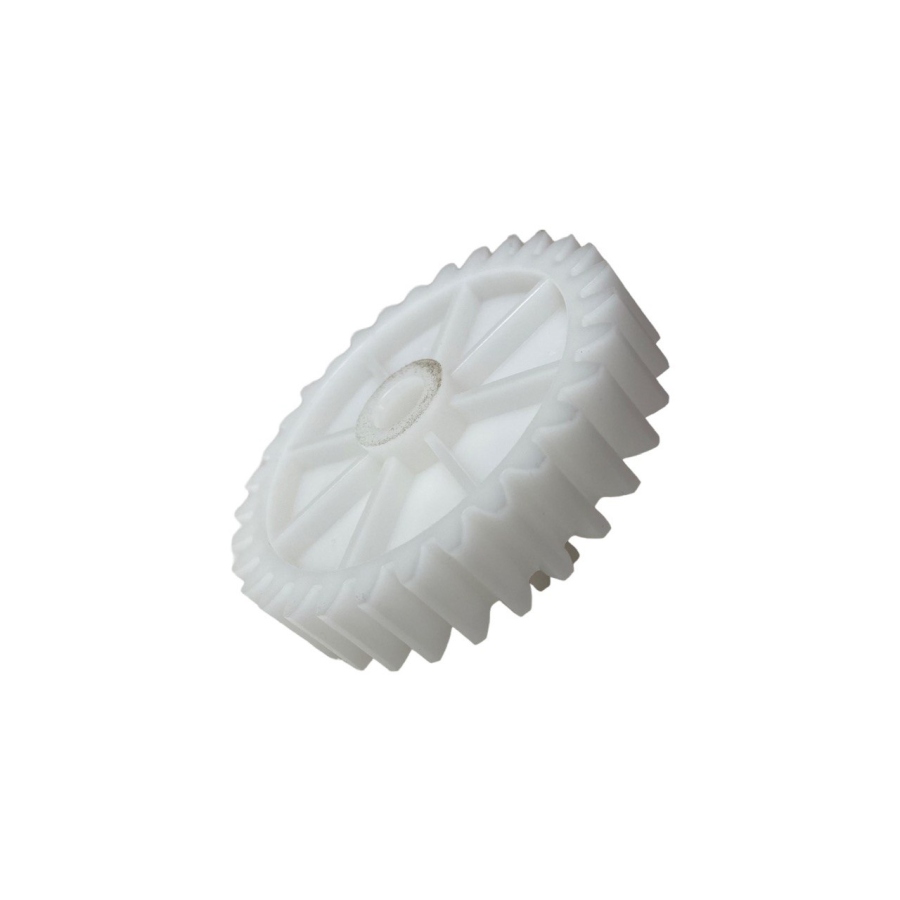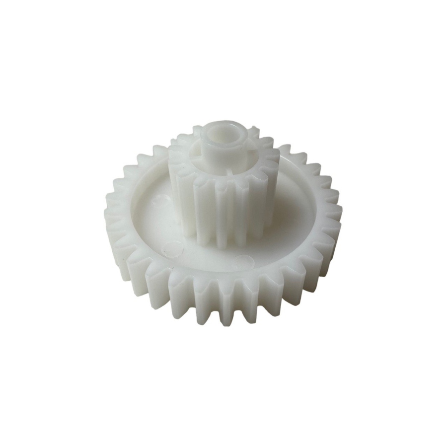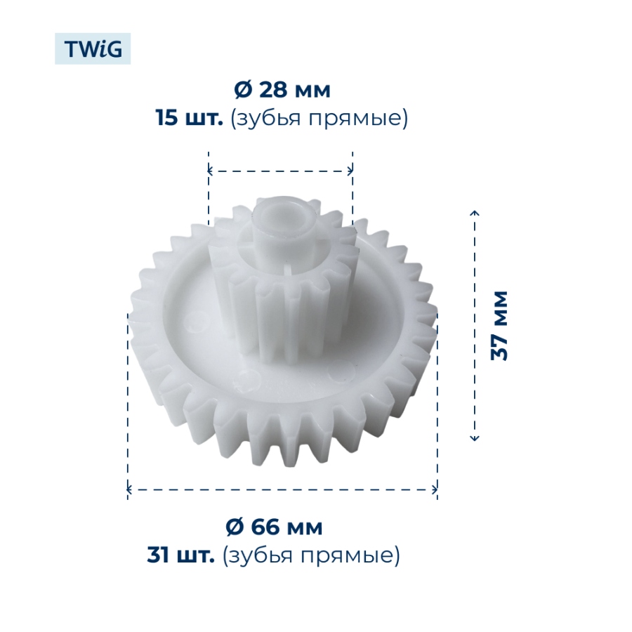 Внешний диаметр: 28 мм (малый), 66 мм (большой), высота — 37 мм, количество зубьев — 15/31, наклон зубьев прямой. Шестерня изготовлена из прочного пластика, рассчитанного на длительную эксплуатацию в бытовой технике. Стандартная геометрия зубьев обеспечивает надёжное зацепление, снижение вибраций и равномерную передачу крутящего момента внутри редуктора.