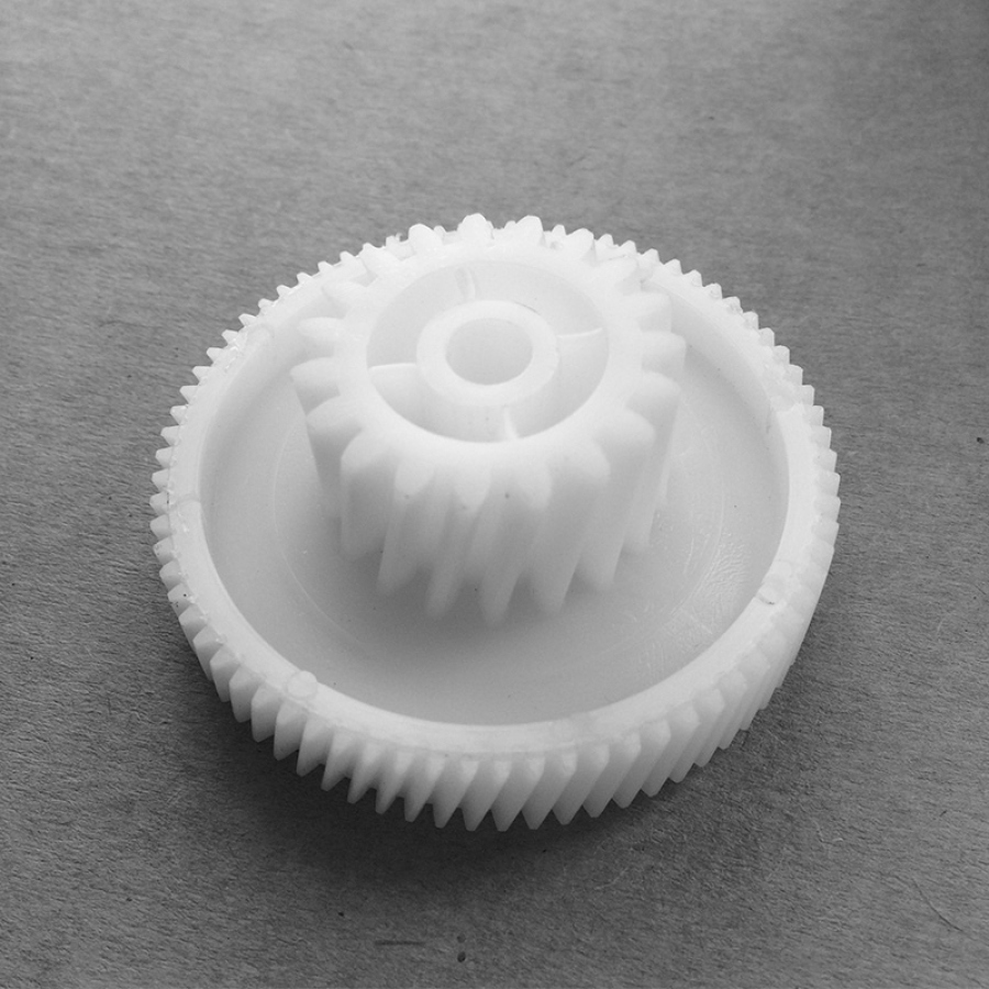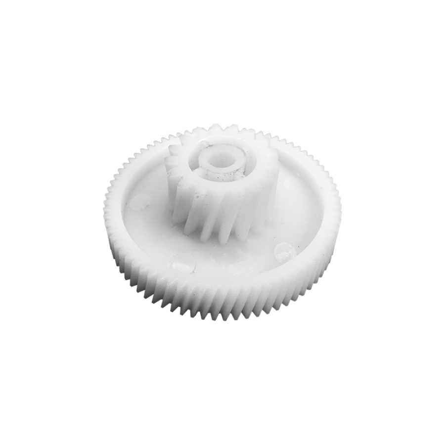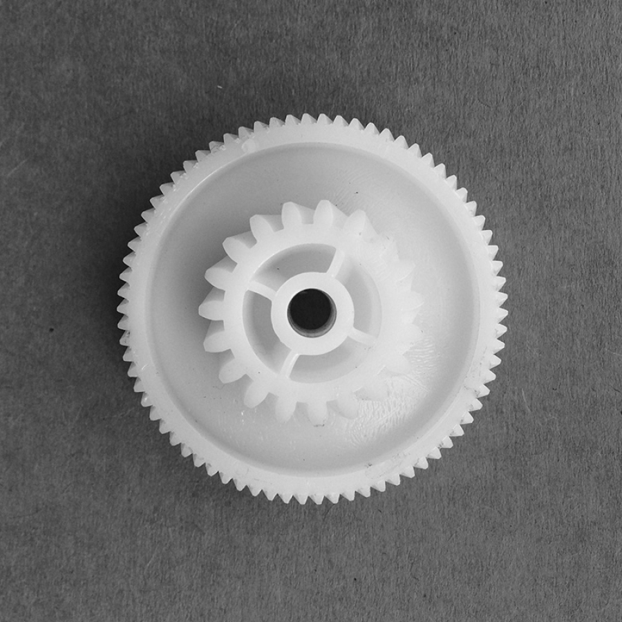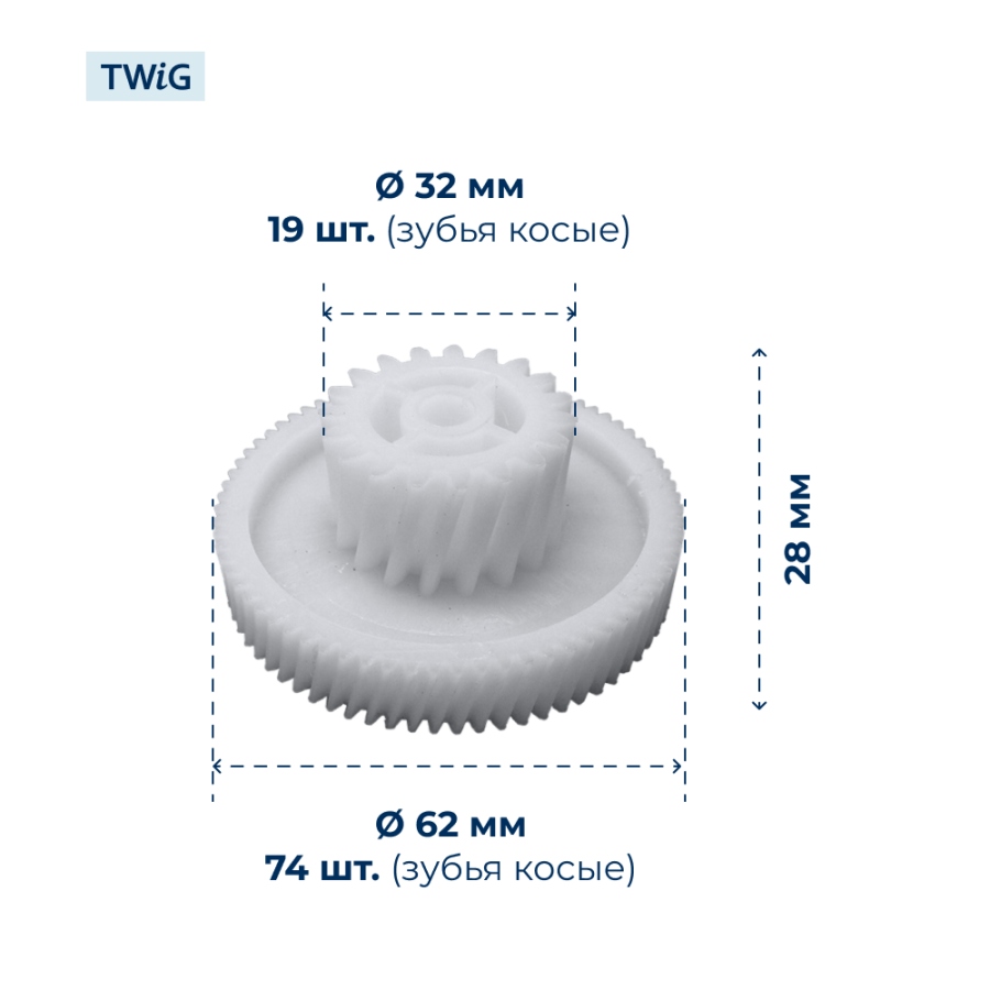 Изделие изготовлено из прочного пластика, устойчивого к постоянным механическим нагрузкам и температурным воздействиям. Внешний диаметр составляет 32 мм (малый) и 62 мм (большой), высота конструкции — 28 мм. Деталь оснащена двумя рядами зубьев: 19 зубьев на малой окружности и 74 зуба на большой. Наклон зубьев косой, что гарантирует плавное зацепление с сопряжёнными элементами редуктора и значительно снижает вибрацию при работе устройства. Такая конфигурация улучшает передачу крутящего момента и минимизирует износ контактирующих поверхностей.