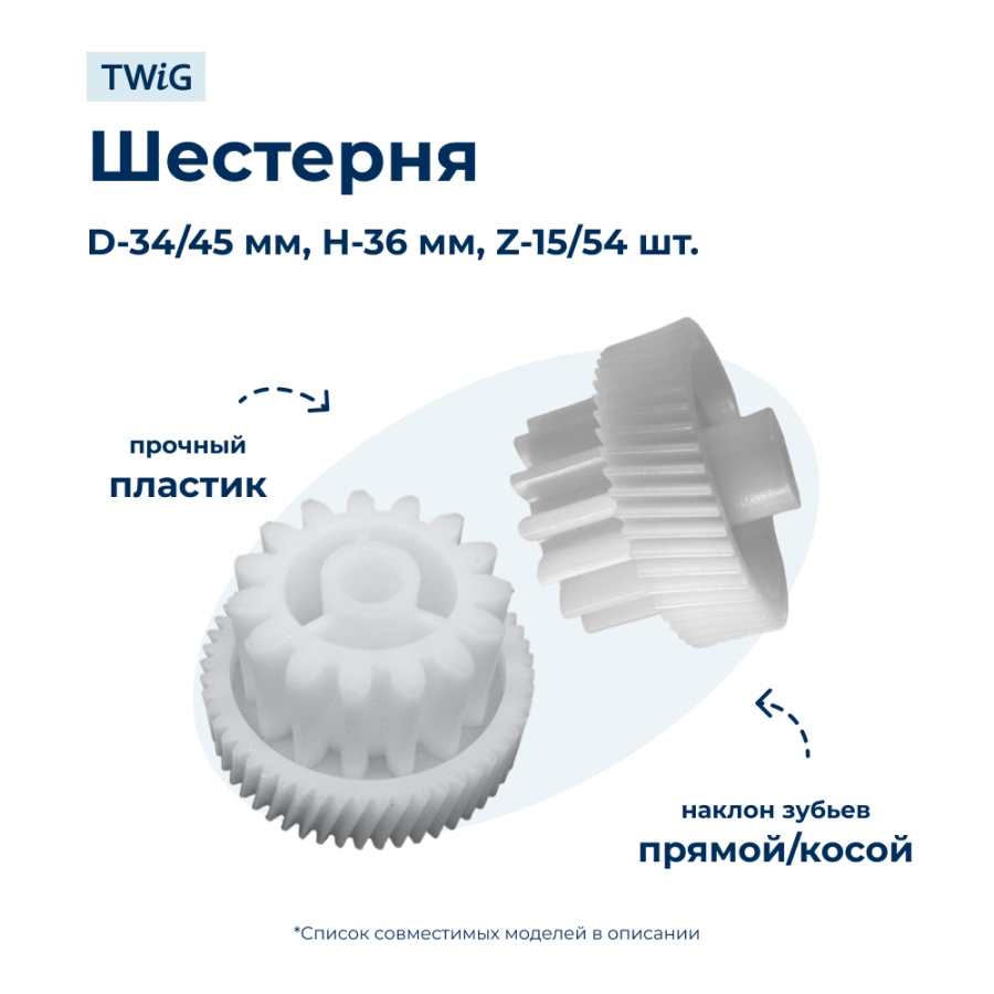Характеристики: D=34/45 мм; H=36 мм; Z=15/54; пластик; профиль зубьев — прямой/косой.