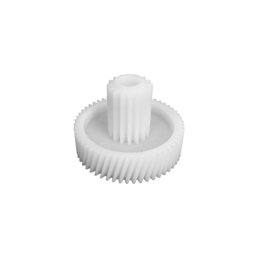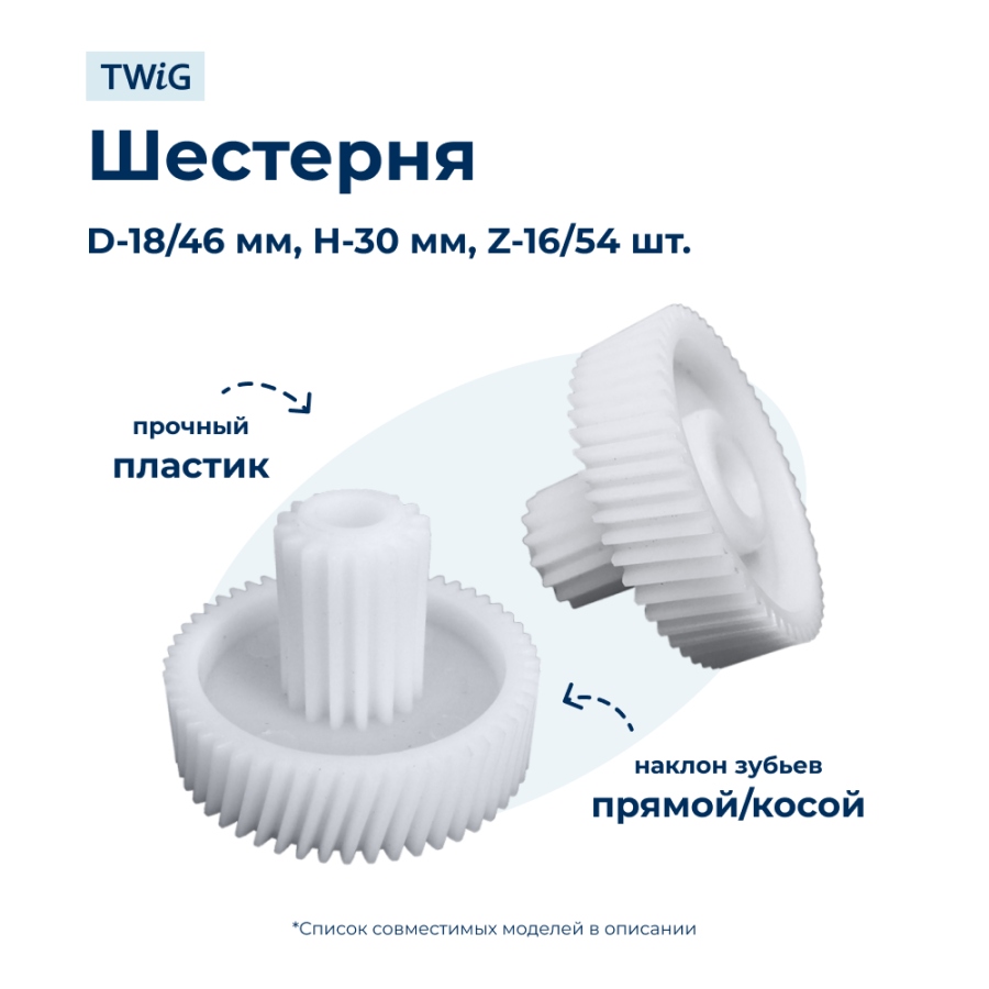 Внутренний диаметр — 12 мм, внешний диаметр — 82 мм, высота — 76,5 мм, количество зубьев — 46; наклон зубьев прямой. Шестерня имеет пластиковое колесо и металлический вал, что повышает надёжность посадки и стойкость к износу. Профиль зубьев подобран таким образом, чтобы обеспечить стабильное зацепление и равномерную передачу усилия в узле редуктор мясорубки.