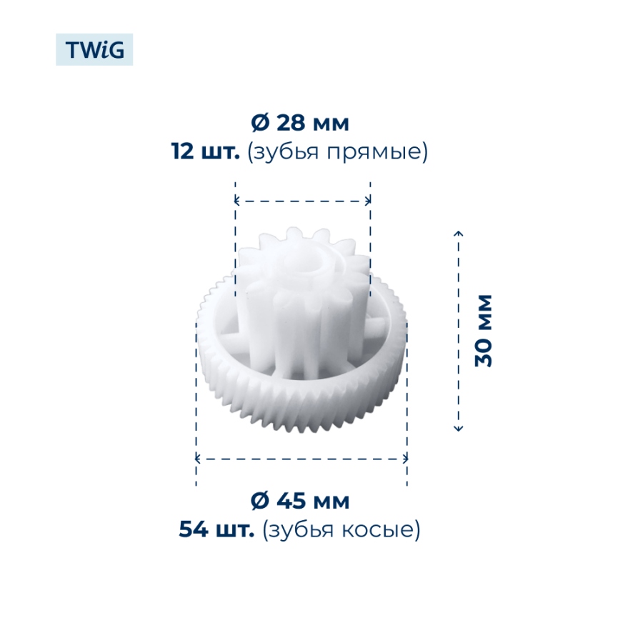Размеры: диаметр 28/45 мм, высота 30 мм, зубья — 12/54, наклон прямой и косой. Конструкция гарантирует плавное взаимодействие с другими элементами механизма.