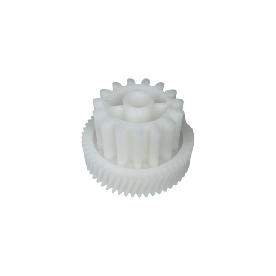 Шестерня выполнена из прочного износостойкого пластика, устойчивого к нагреву и механическим воздействиям. Конструкция включает два венца диаметром 34 и 45 мм, общая высота — 36 мм, количество зубьев — 15 и 54 соответственно. Комбинация прямых и косых зубьев обеспечивает плавное зацепление с минимальным уровнем шума и вибраций, продлевая срок службы редуктора.