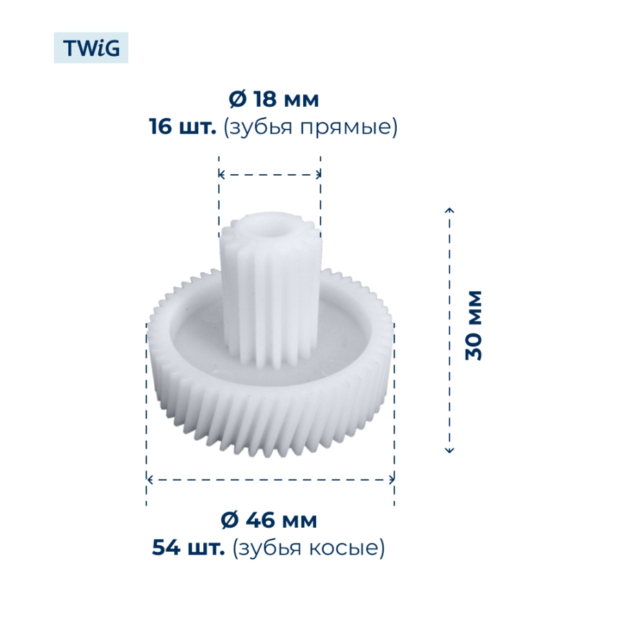 Изделие изготовлено из качественного пластика, устойчивого к постоянным механическим нагрузкам и температурным воздействиям. Внешний диаметр составляет 18 мм (малый) и 46 мм (большой), высота конструкции — 30 мм. Деталь оснащена двумя рядами зубьев: 16 зубьев на малой окружности и 54 зуба на большой. Наклон зубьев комбинированный — прямой и косой, что обеспечивает плавное зацепление с ведомыми элементами и минимизирует ударные нагрузки при запуске. Такая геометрия улучшает передачу вращения и снижает уровень шума при функционировании устройства.