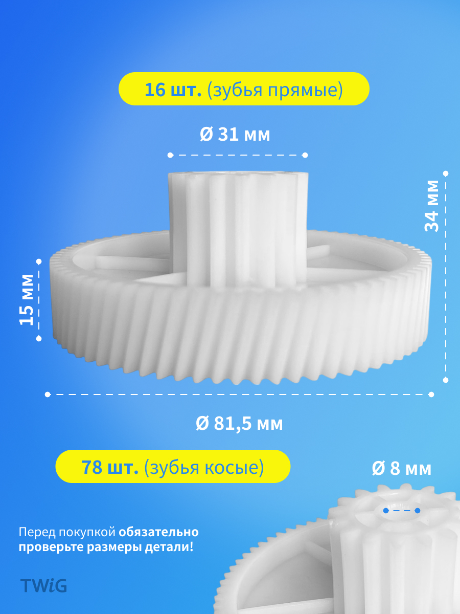 Рекомендации: Перед заказом убедитесь в соответствии размеров и формы зубьев с оригинальной шестерней вашей мясорубки. Производители могут использовать разные конфигурации в зависимости от года выпуска и ревизии модели.D=31/82 мм, H=34 мм, Z=16/78 шт., наклон зубьев - прямой/косой.