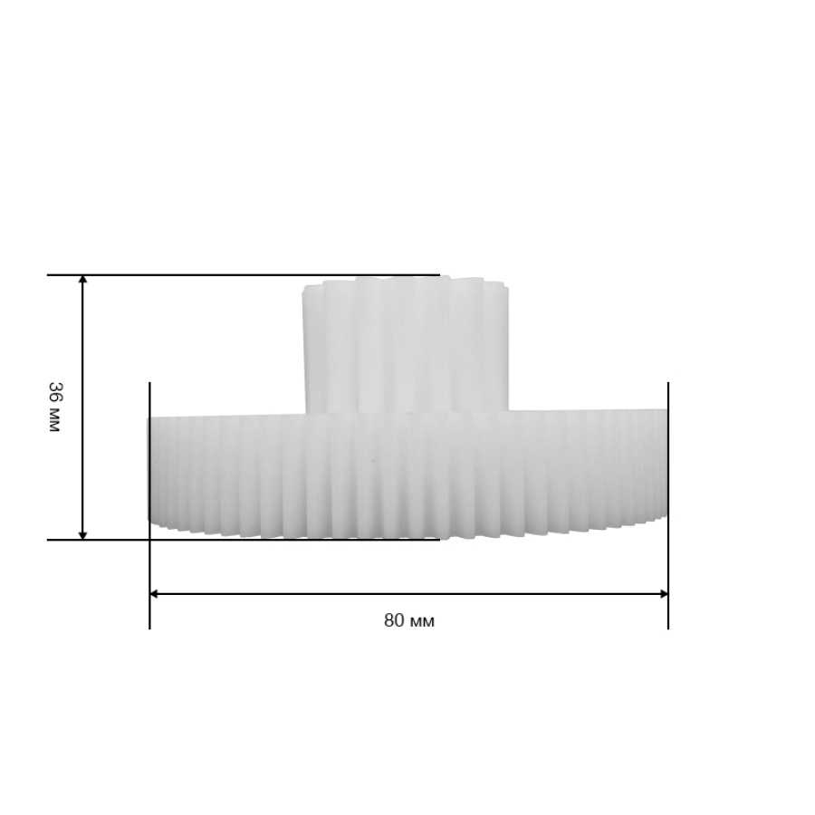 Внешний диаметр: 32 мм (малый), 80 мм (большой), высота — 36 мм, количество зубьев — 16/78, наклон зубьев прямой. Шестерня изготовлена из прочного пластика, рассчитанного на длительную эксплуатацию. Геометрия зубьев обеспечивает надёжное зацепление и равномерную передачу крутящего момента внутри редуктора.
