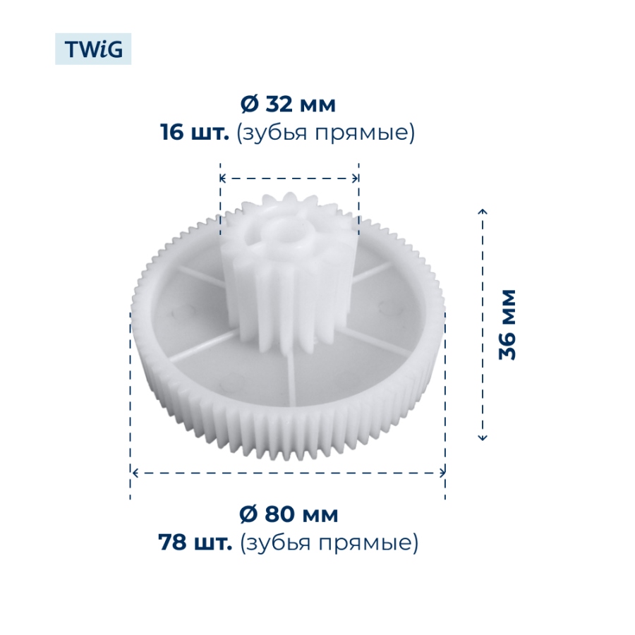 Внешний диаметр: 32 мм (малый), 80 мм (большой), высота — 36 мм, количество зубьев — 16/78, наклон зубьев прямой. Шестерня изготовлена из прочного пластика, рассчитанного на регулярную эксплуатацию. Профиль зубьев обеспечивает надёжное зацепление и равномерную передачу момента в редукторе.