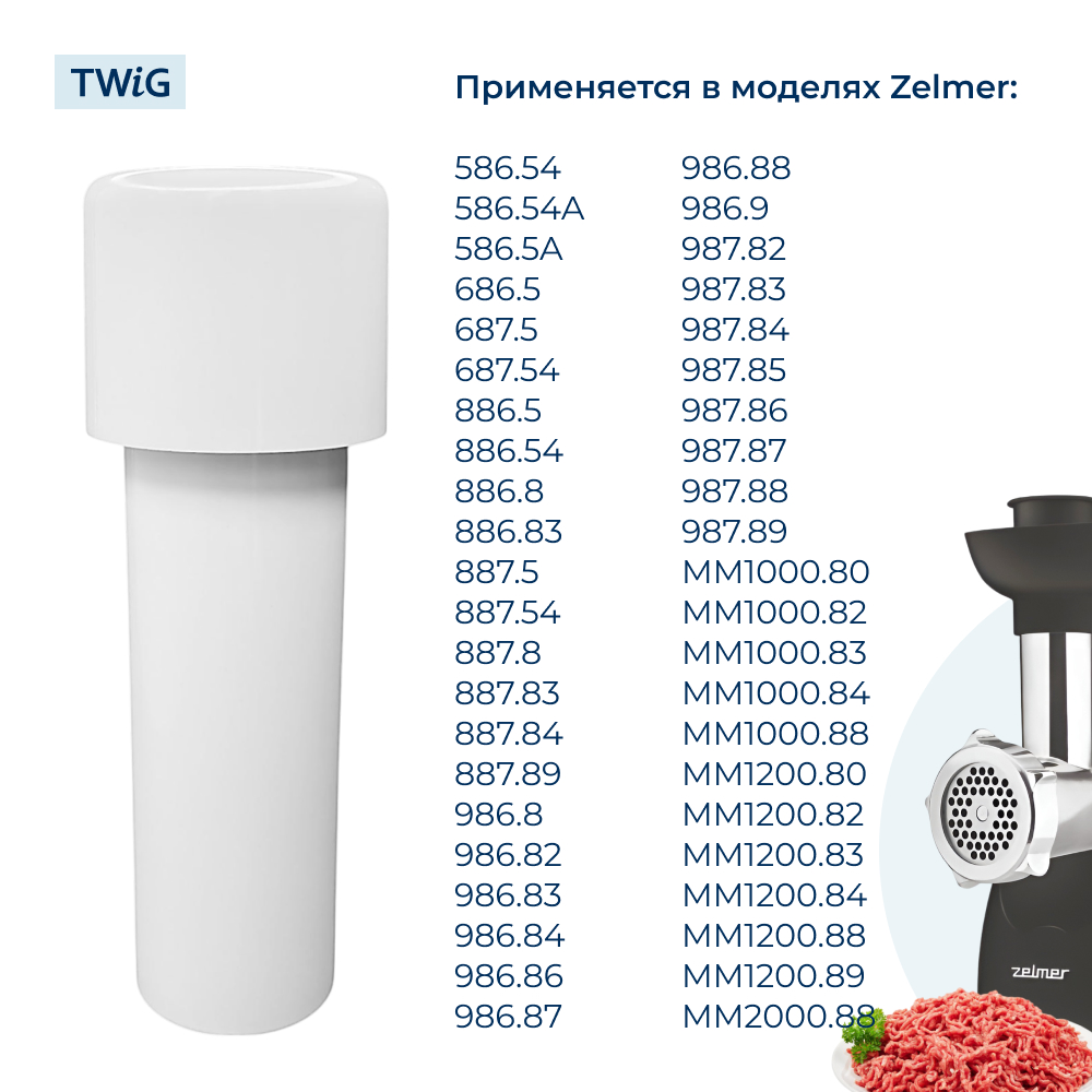 Толкатель подходит для широкого ряда моделей мясорубок Zelmer, включая популярные серии, такие как 886.5, 886.8, 986.8, 986.86, 887.84 и другие. Он обеспечивает надежное давление на мясо, овощи и другие продукты, помогая шнеку эффективно захватывать их для измельчения. Использование толкателя вместо подручных средств предотвращает поломку мясорубки и обеспечивает безопасность работы.