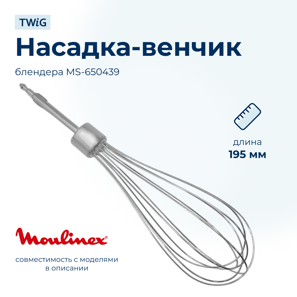 Насадка-венчик Moulinex MS-650439 — оригинальный аксессуар для ручных блендеров и миксеров серий DD и HM. Изготовлена из нержавеющей стали, надёжно фиксируется в редукторе и обеспечивает равномерное взбивание сливок, яиц, соусов и других ингредиентов.