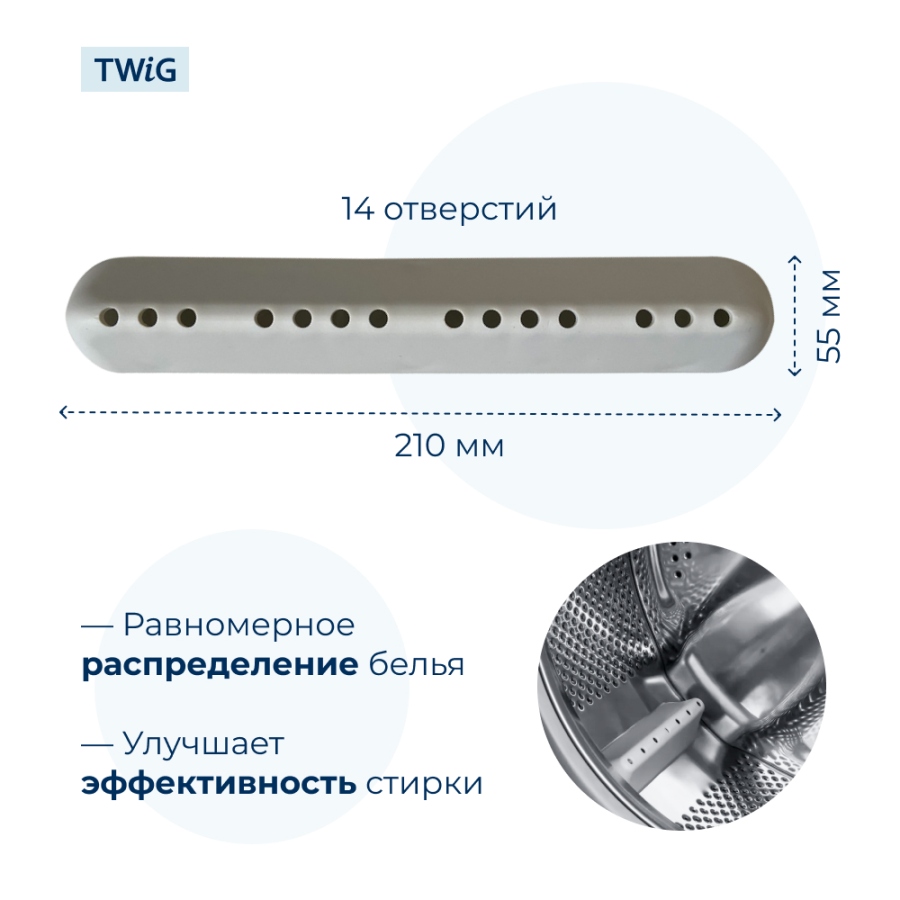 Ребро барабана имеет длину 210 мм, ширину 55 мм и высоту 35 мм. С 14 отверстиями в корпусе, ребро барабана обеспечивает оптимальную циркуляцию воды и моющего средства, улучшая качество стирки. Благодаря 6 защелкам легко крепится к барабану.
