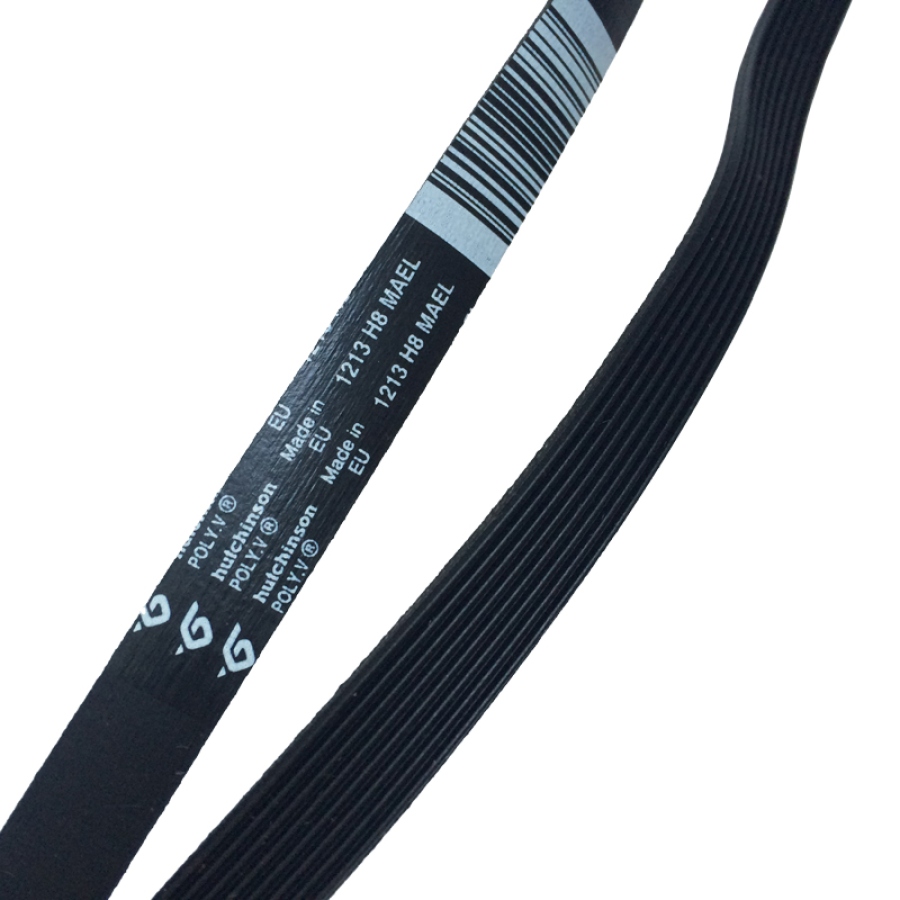 Эластичный приводной ремень из резины с кордом. Длина ремня 1213 мм, профиль клиньев H. Количество клиньев в ремне 8 штук.