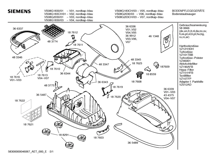 Запчасти для Siemens VS08G183CH/01 (58300000046067_aet_000_e_01)
